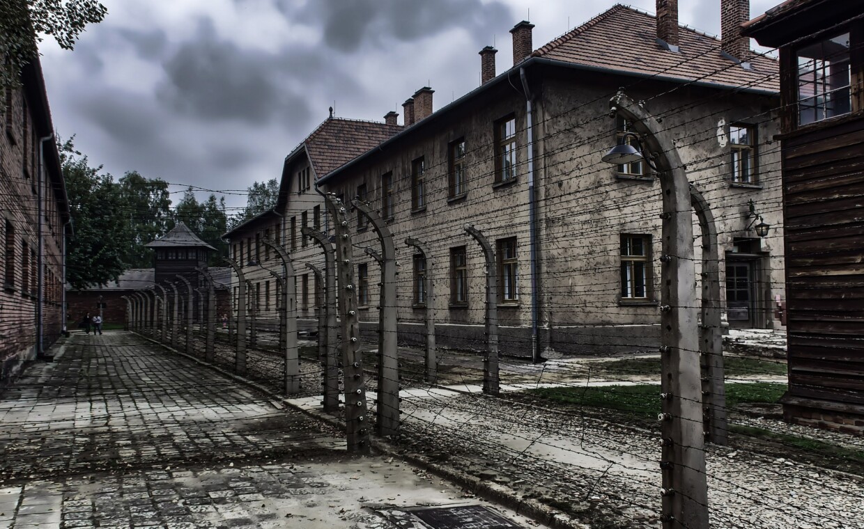 - A number of watchtowers along the electrically charged barbed-wire fences surrounding the site of a genocide at Birkenau